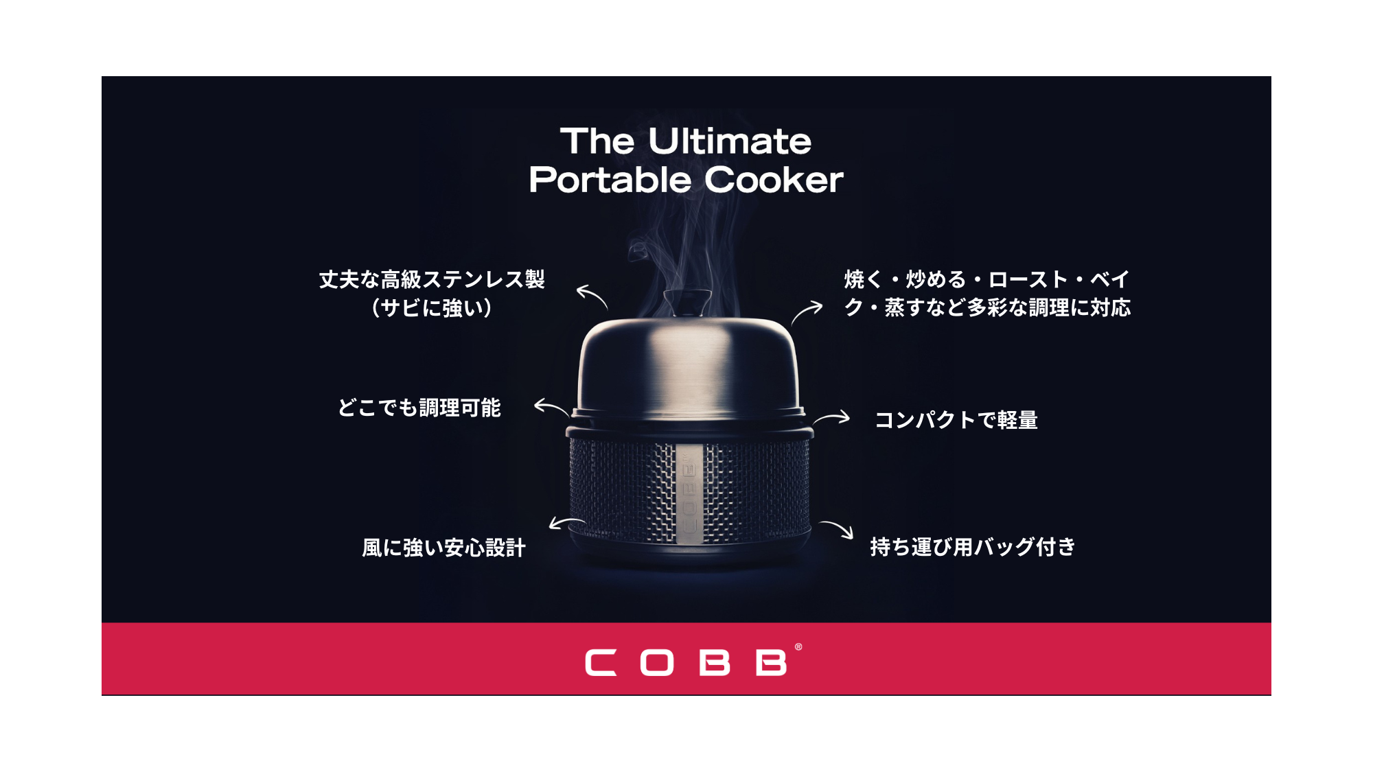 COBBグリルは、持ち運びしやすく、風にも強いアウトドア仕様。豊富なアクセサリーとキャリーバッグで、焼く・ベイク・ロースト・炒めるなど、多彩な調理をどこでも楽しめます。